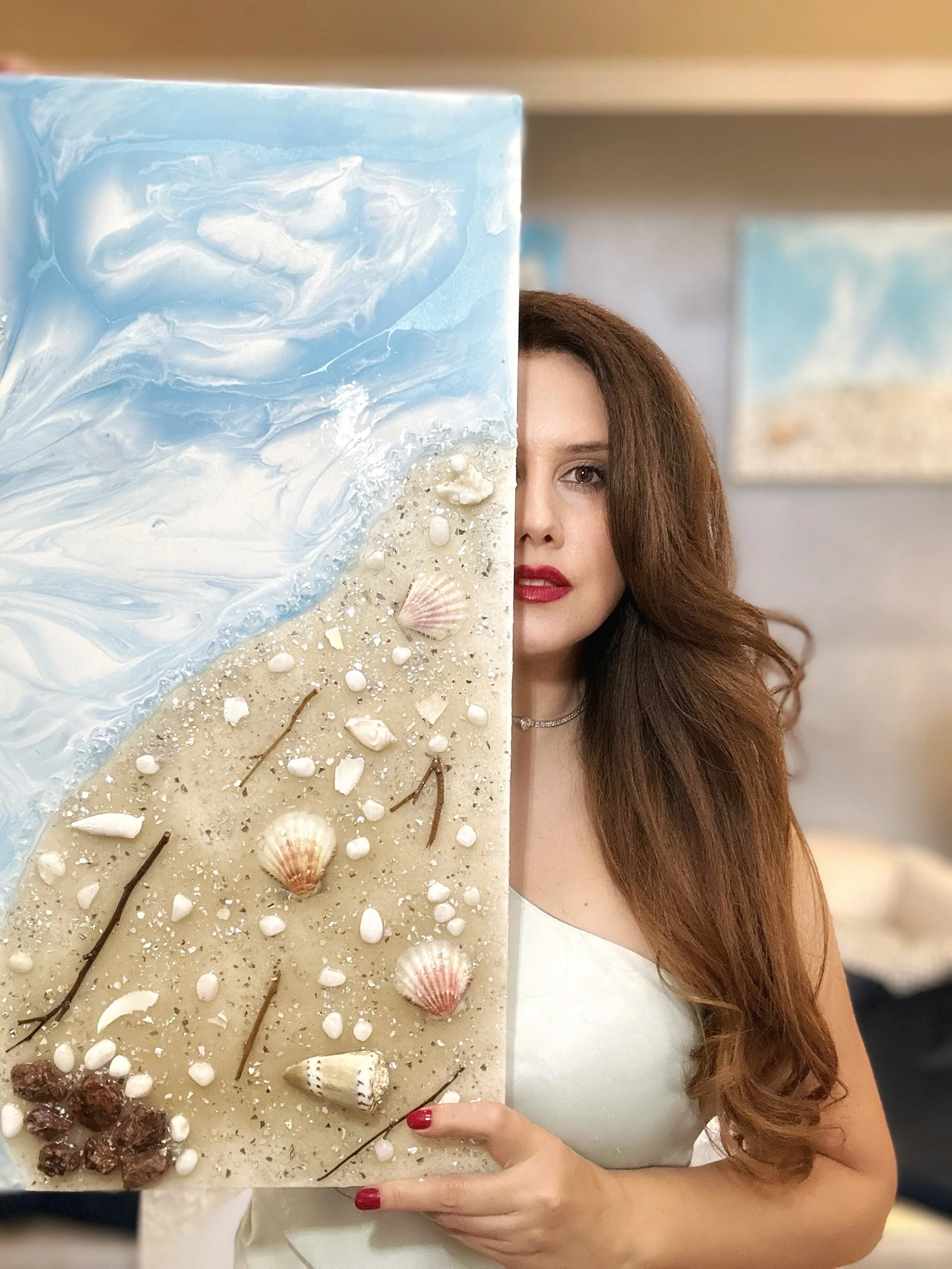 Using mixed media techniques — including resin, pigments, crystals, sand, and natural elements, Joice creates artworks that evoke light, movement, and emotional depth.